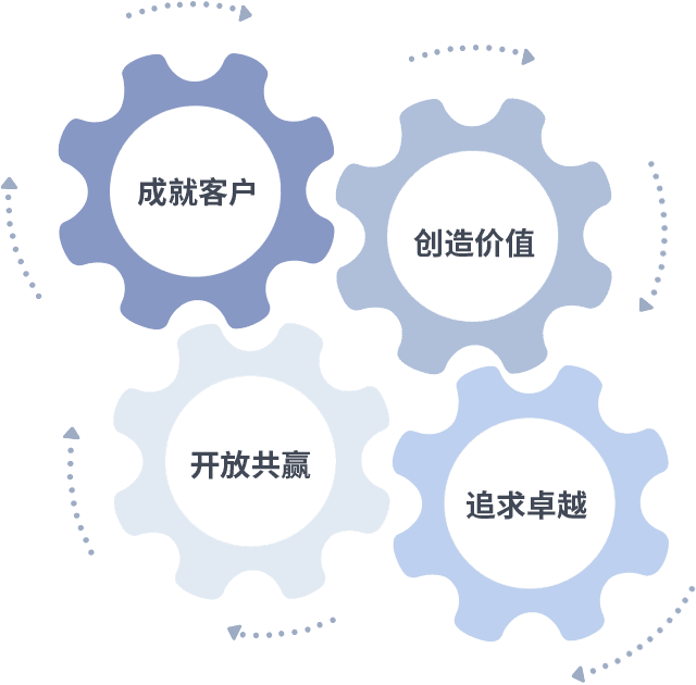 成就客户是一切决策的出发点,,,创造价值是衡量所有工作的标准,,,,追求卓越是我们做事做人的态度,,开放共赢是我们的格局也是最终的结果。。。价值观的齿轮环环相扣,,,推动着组织里的每个人不断向前。。。