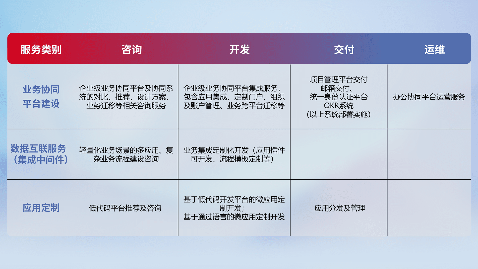 针对钉钉、、企微、、、IDaas等平台级产品提供产品的规划、、、、方案、、、交付、、定制化开发等服务,,,实现如统一协同办公、、、、智能客户服务、、、、混合会议管理、、智能数据查询、、、等业务场景,,实现数字化转型。。。