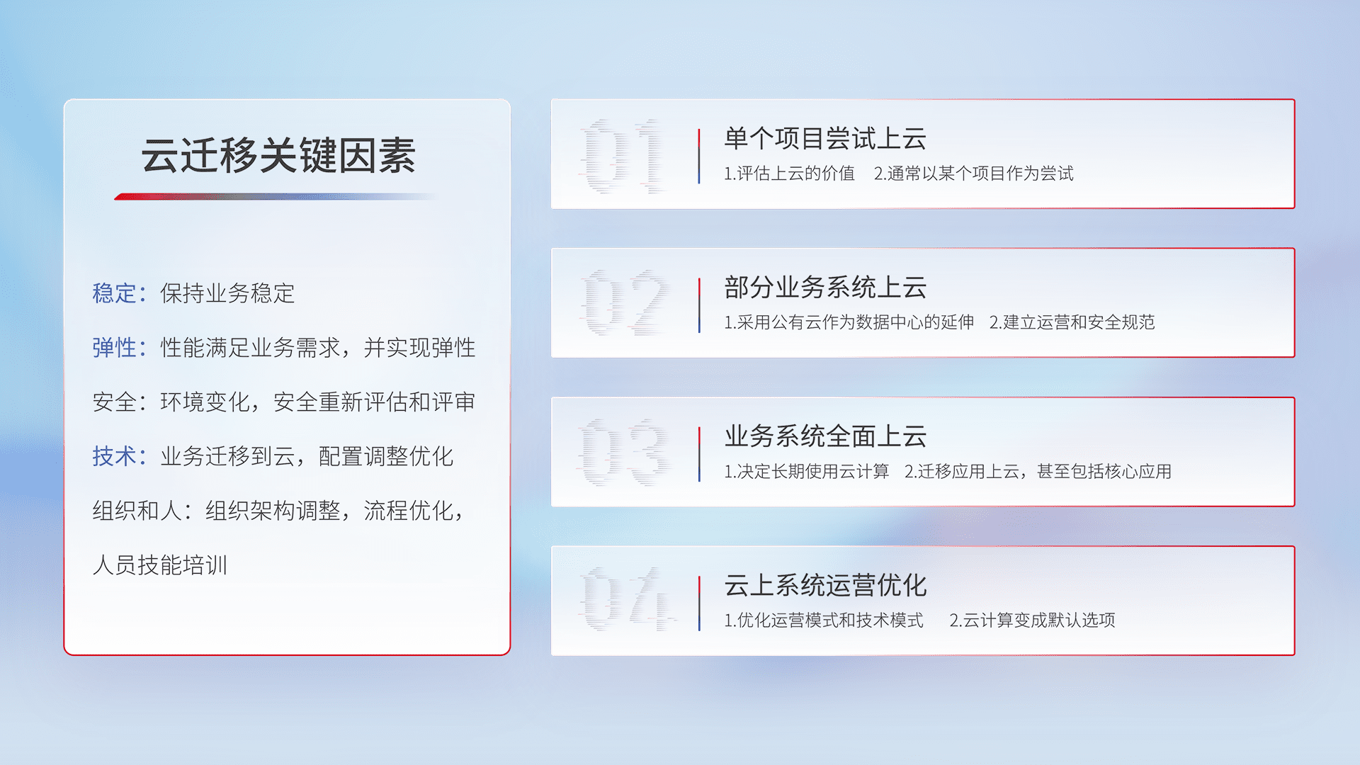结合实际业务,,从规划设计、、云平台选型、、、云原生改造、、数据迁移、、、集成交付,,,迁移全过程为客户识别最佳上云路径,,,做好风险识别管理,,设计网络架构、、、身份权限、、安全审计合规、、、、操作审计、、、日志审计、、监控告警策略、、多站点容灾设计等,,,对云上基础设施进行整体规划,,提升IT治理水平,,,以满足弹性、、、、高可用、、、、高性能的需求。。