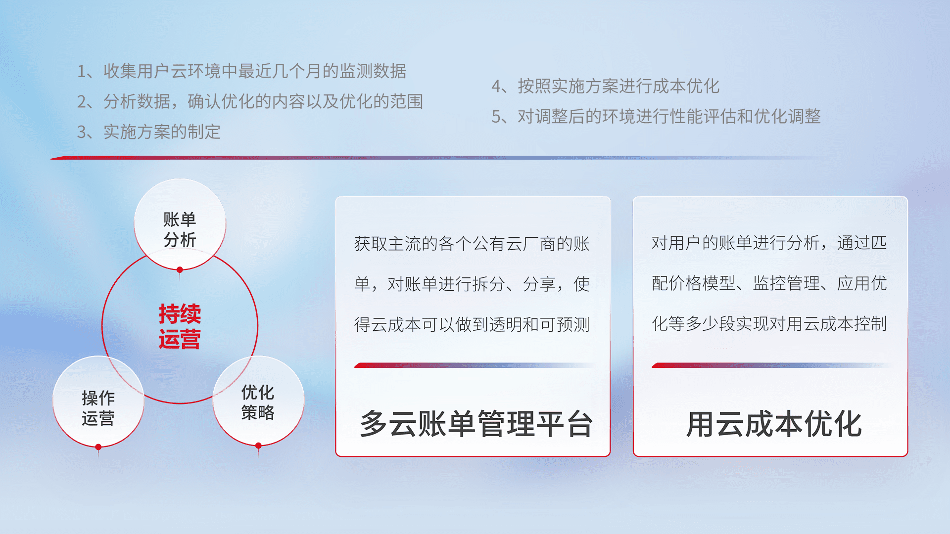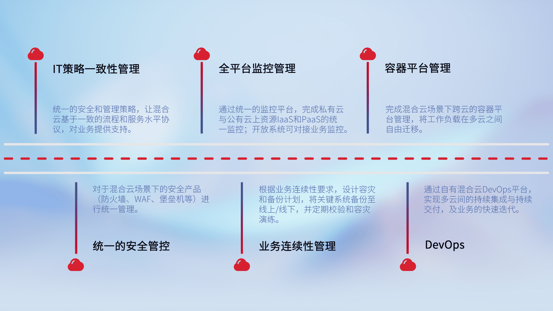 通过多云纳管,,,以统一的资源数据模型把客户的云资源进行抽象和封装,,,,进而实现对多云资源的统一操作,,,,保障云资源管理的可靠性、、稳定性与可用性。。。。量身定制化运维内容,,,,配置、、开发运维、、、补丁管理、、、备份、、、监控、、、认证和访问管理、、、审计和日常巡检等,,,保障在用云过程中的可靠度,,,,稳定度以及高可用率。。