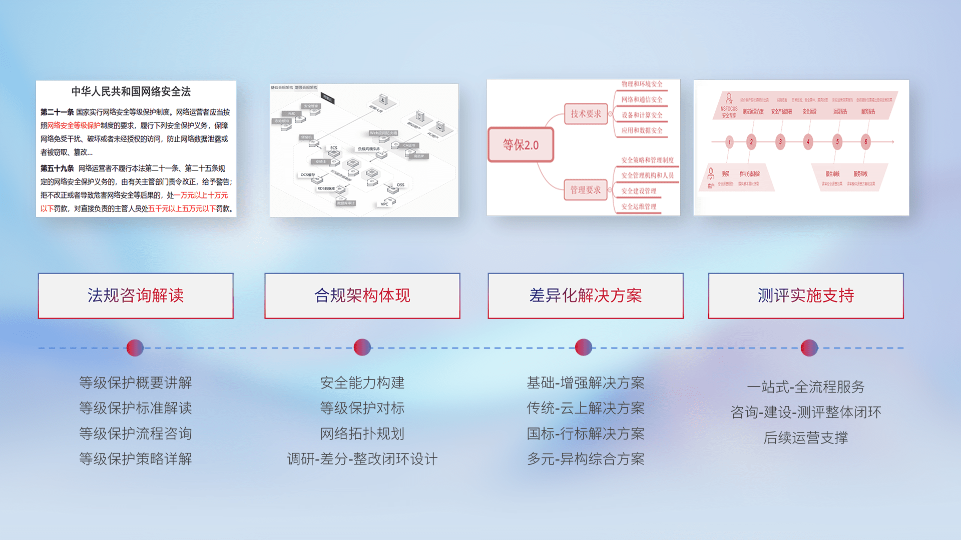 通过专业的法律咨询解读、、、、合规架构体现、、差异化解决方案、、、、测试实施支持等服务,,,,为客户量身打造等保合规体系。。。